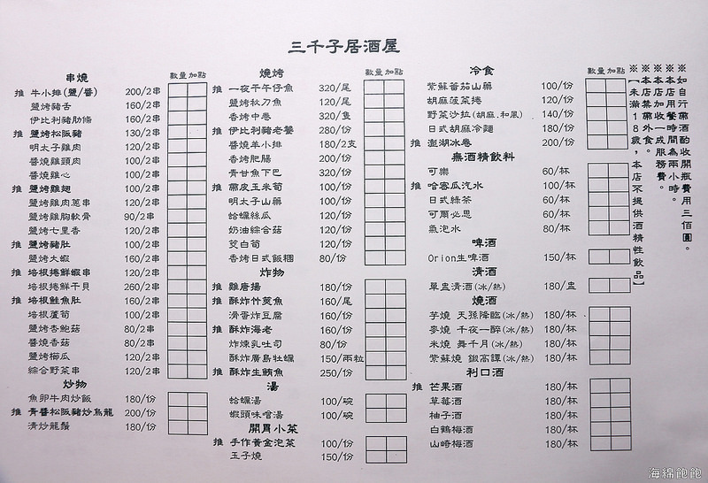原文:『三千子居酒屋』生啤買二送一/伊比利豬老饕/羊小排/串燒/炸物/下酒菜/啤酒/梅酒/包場/菜單MENU價位(捷運信義安和站)