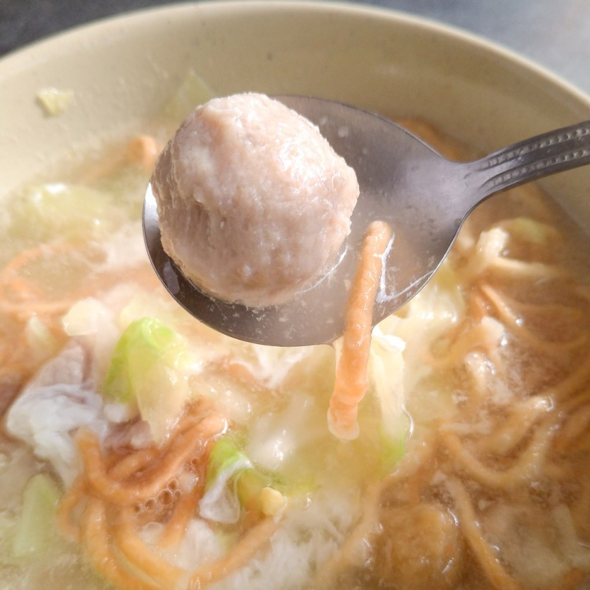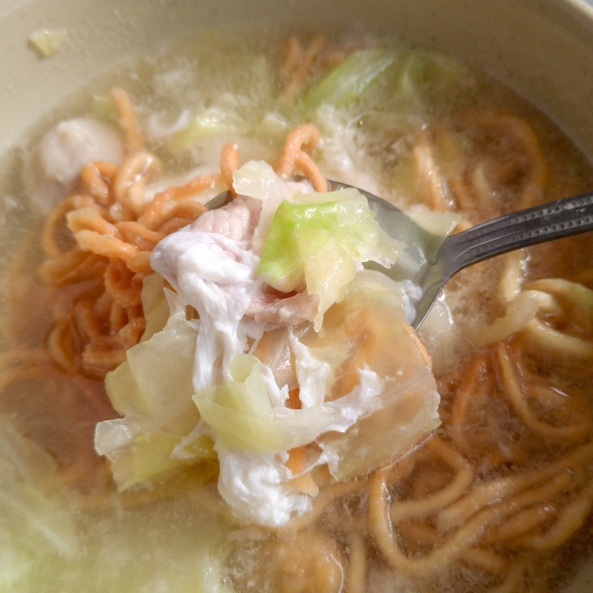 有高麗菜、肉片、魚板、小黑輪、魚丸以及一顆雞蛋,大碗的就是多加一坨意麵。