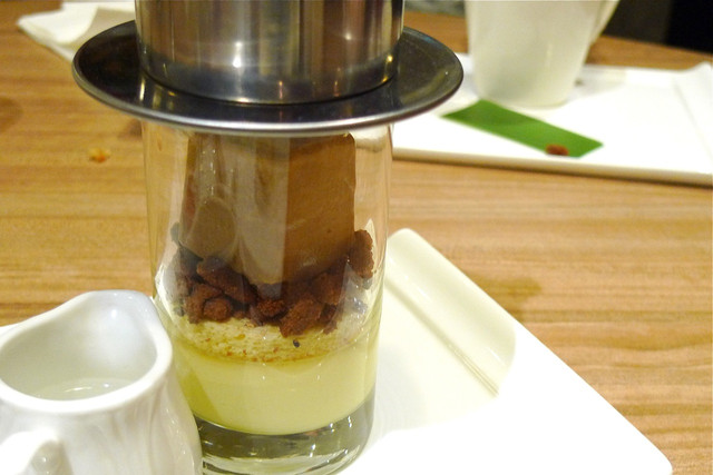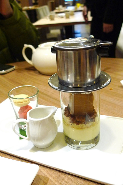 上桌後在越南咖啡壺中加入熱水,等待咖啡緩緩流入下面的甜點