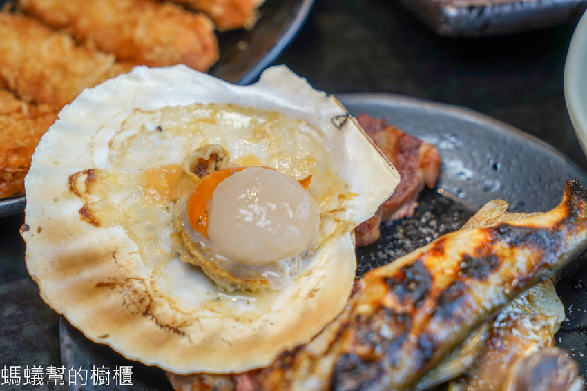 鹽烤鯖魚。風螺。鹽烤香魚。味付干貝。一盤新鮮海鮮組合,風螺其實單價也不便宜,在這裡也能享用到風螺的脆口口感,香魚跟鯖魚的鮮嫩肉質,對於喜愛吃海鮮的我是相當開心的。