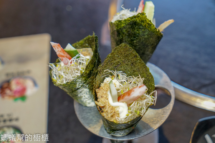 蟹肉沙拉手捲。現點現做的手捲,上桌後建議先吃,享受海苔脆口沙拉新鮮的口感。