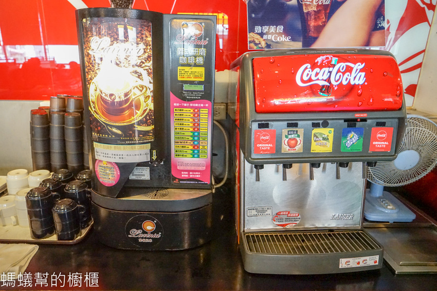 可口可樂系列冰飲或是旁邊的熱咖啡機,飲品都可無限暢飲。
