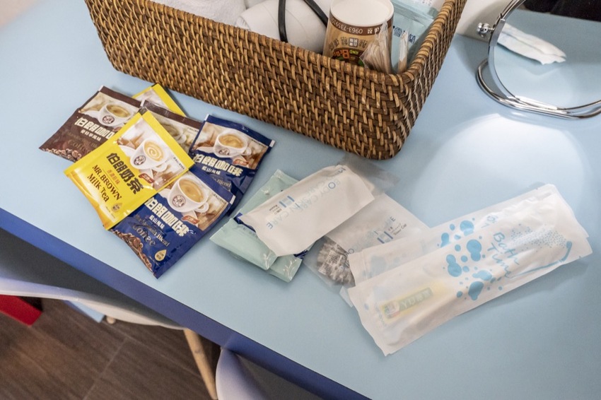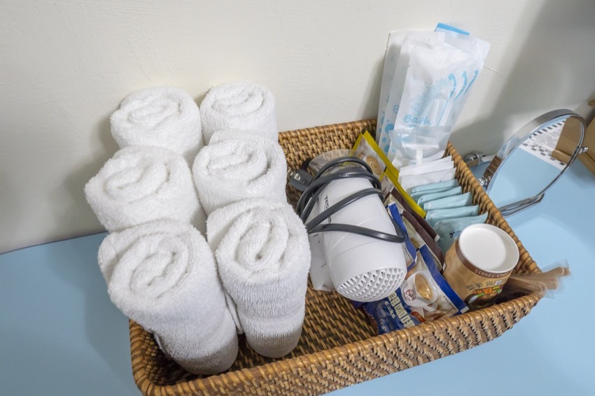 房間備品一應俱全,浴巾、盥洗用具、棉花棒等等