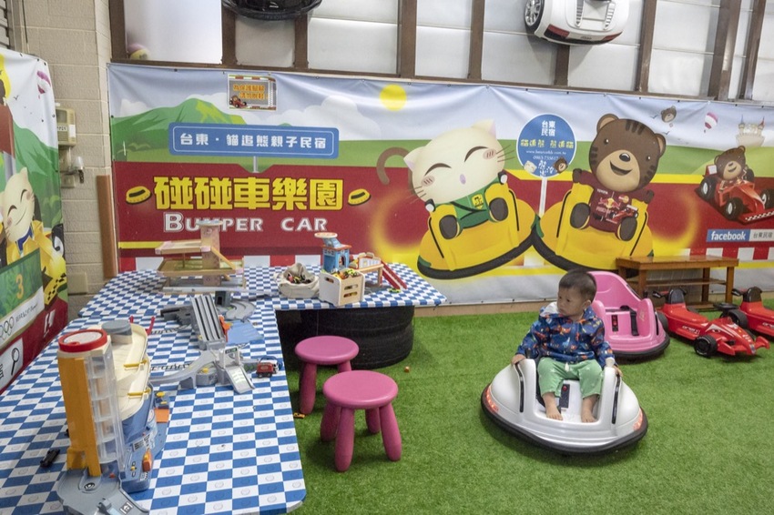 貓追熊親子民宿 大方把空間化身為遊樂場,讓孩子可以盡情的在這天堂裡面玩耍跑跳,而打造賽車場..等等的設施,也是許多小孩的夢想車與遊樂園,看見小朋友從遊戲中透露出最自然的微笑,身為父母的也很開心與幸福