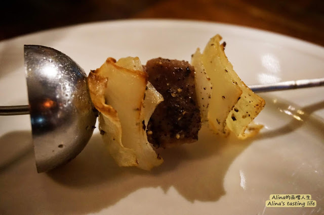 霸氣的串燒啊!總共有五根這樣一根平均是112元~好貴啊~而且還要加服務費!點的當下是想一次可以吃到好幾種肉,但是送上來我覺得量可以再多一點,比方說肉塊可以再大一點!