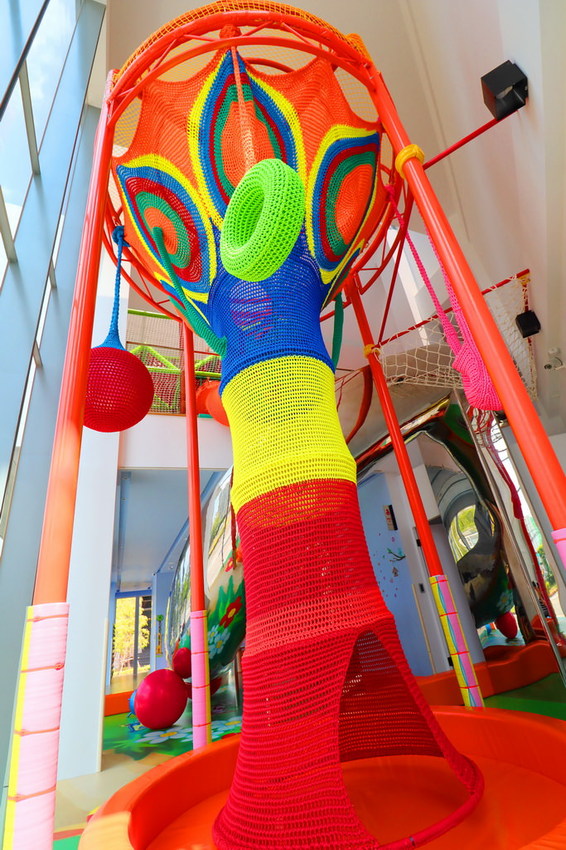 用盡力氣才能爬上去的「彩虹神木」,由一樓延伸到二樓的管狀繩網,我們看到大部分的小孩都由下往上爬(也可以從二樓往下),大人光看了就累,小孩們卻玩的不亦樂乎?沒關係,讓他們爬完一、二次大概就可以回房間掛在床上了。