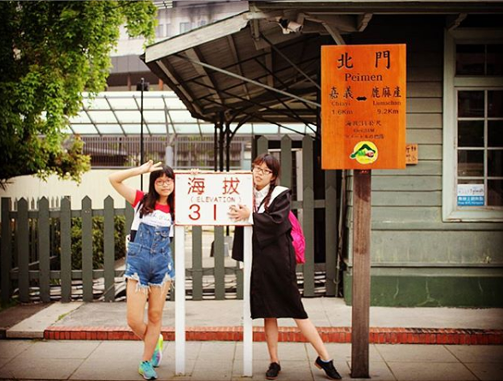 入口處的拱門,上頭有著櫻花圍繞,象徵著北門驛是阿里山的入口,優雅的拱門女孩常在花園中看到,搭上公園上真的好加分,整個氛圍都不一樣了