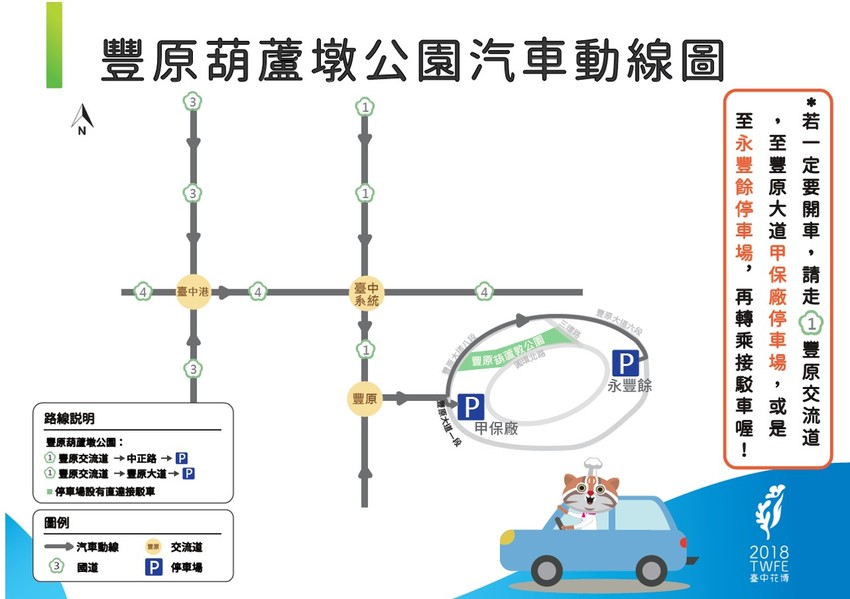 豐原葫蘆墩公園的汽車動線圖,請走國道一號下豐原交流道