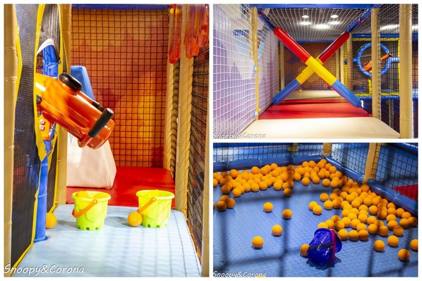 除了溜滑梯和球池還結合了許多機關,像是彈跳床、球槍射擊,
