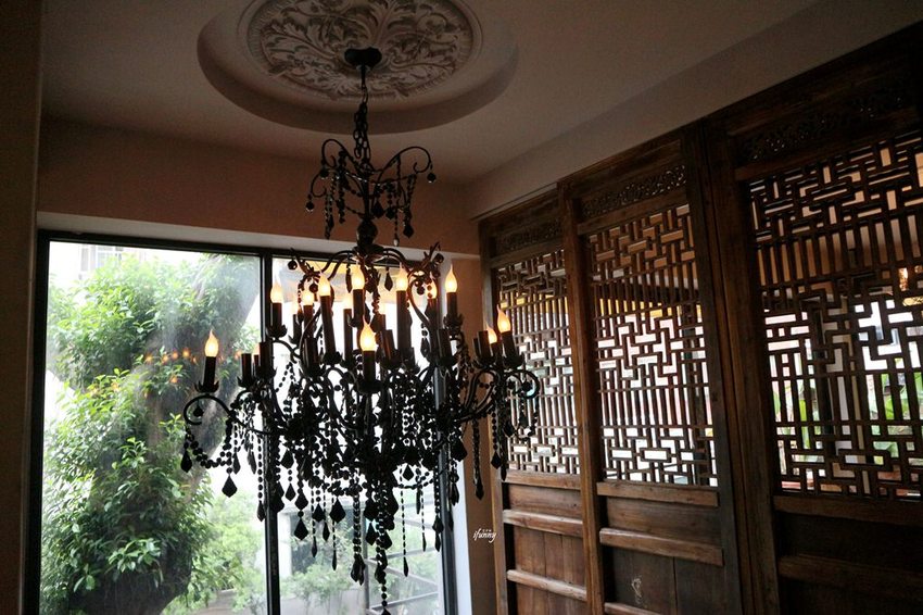 接著拾級而上往二樓走,東方的窗花,加上有如在歐洲城堡中才會出現的吊燈,在窗外綠蔭的相襯下,別有一番風情。