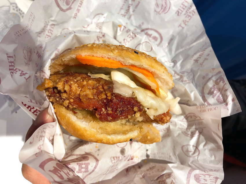 火辣嫩雞堡,顧名思義就是以雞肉做為內餡,不過這裡用的是雞腿排,雞肉以酒槽方式,將酒的香氣以及肉香結合一起