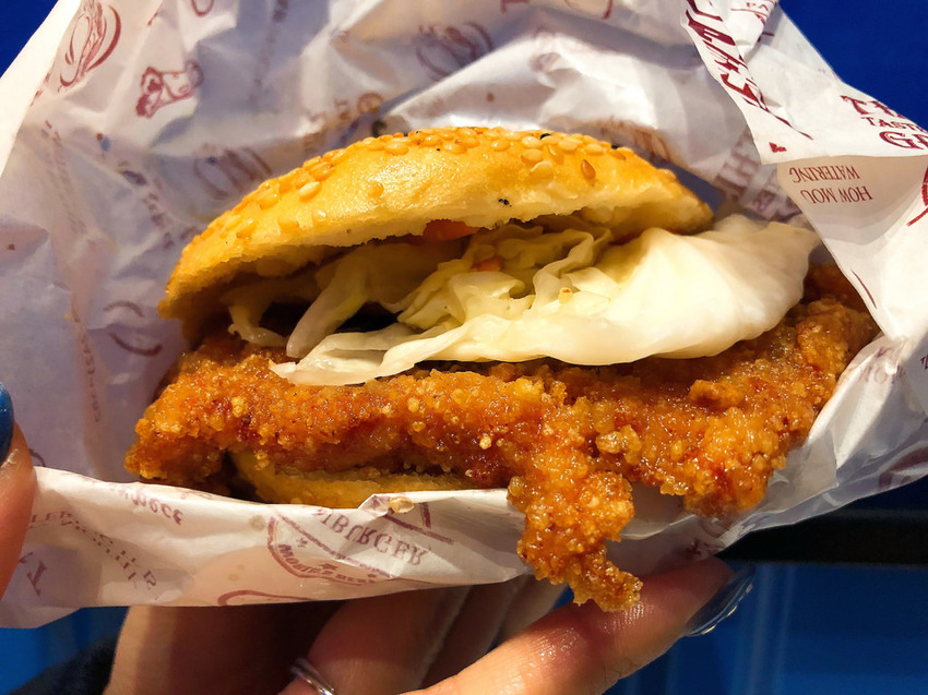 大片的炸豬排,配上有別於以往漢堡的生菜,這裡的生菜取而代之的是台式泡菜