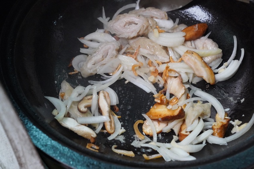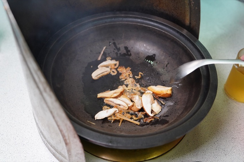 熱鍋後,加入蝦米、魷魚、香菇,將香氣給炒出來