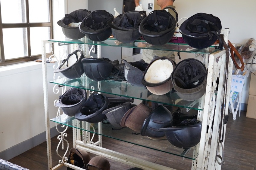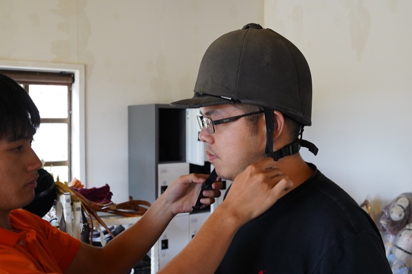 騎馬前先在服務中心著裝,裝備有手套、騎士帽以及綁腿