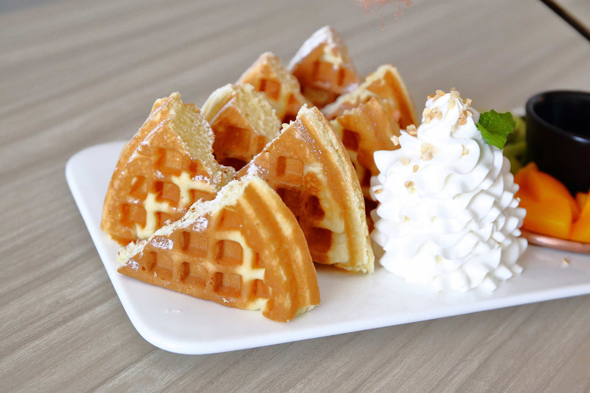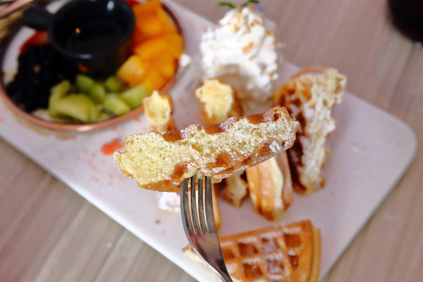 鬆餅是屬於比較扎實的口感,與鮮奶油一起吃,不甘澀搭配得嘟嘟好