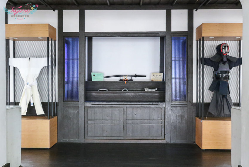 走進超大彈簧木地板會有微微的晃動感,是2大片組成,禁止在上頭蹦蹦亂跳,現場展示柔道服、劍道服和武士刀。