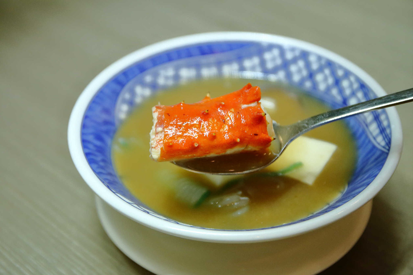 帝王蟹石狩鍋,很大氣的給了帝王蟹腳,裡面的蟹肉很大一塊,又鮮又多汁,超好吃,吃起來超過癮啊!