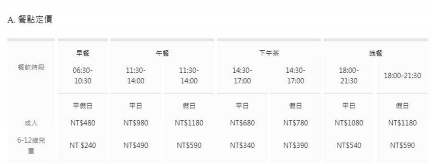 吃到飽價位如下,分成早餐、午餐、下午茶、晚餐四種類型,平日、假日不同價