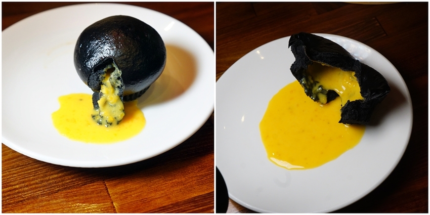 沉穩的黑色外皮是用墨魚汁調色,內餡裡還加上了松露,一口咬下除了可以感受到飽水的肉餡外,濃郁的松露氣息迴盪在嘴裡,風味上相當特別呢。