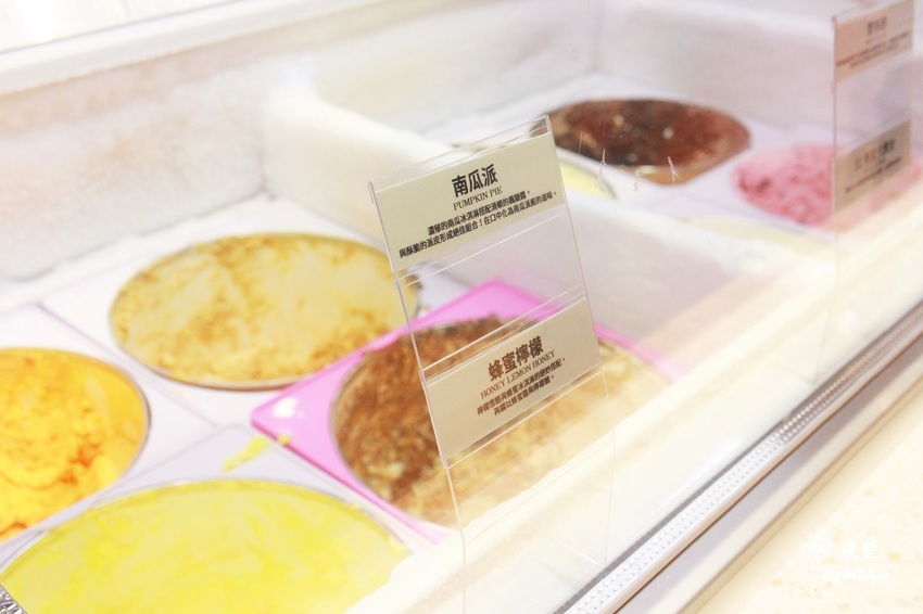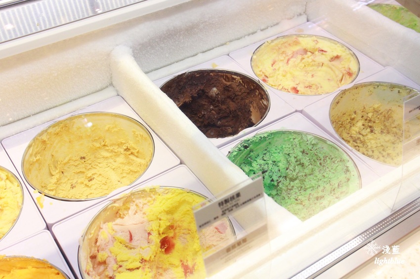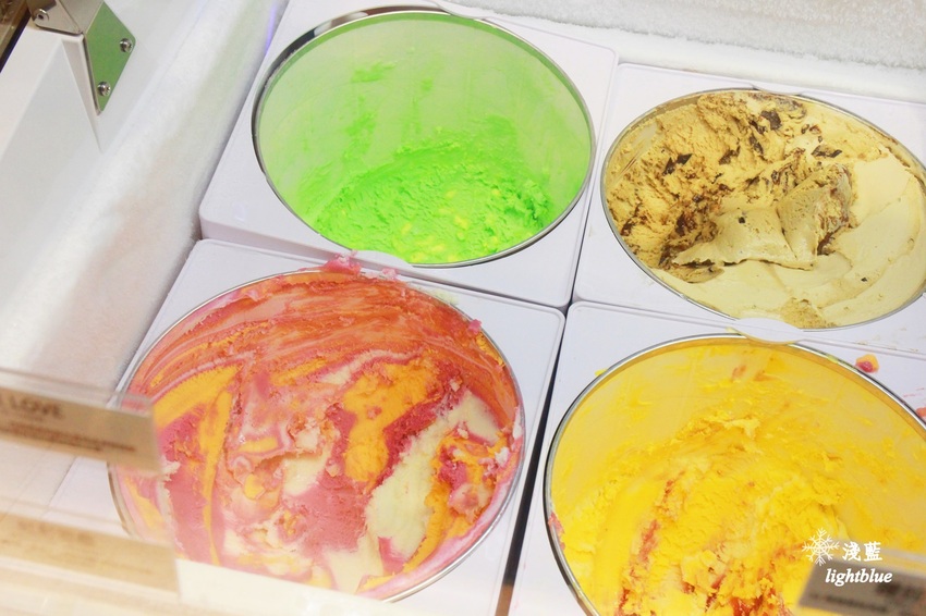 上方有漂亮莓果色的是「博根地櫻桃」,吃得到整塊櫻桃果肉,而且不是味道很重的酒漬櫻桃,整體奶味略重,很順口。底下是「水蜜桃梅爾巴」,有水蜜桃的迷人香甜,帶一點覆盆子微酸,吃完不會口渴,而且會很想再多吃幾種口味呢!