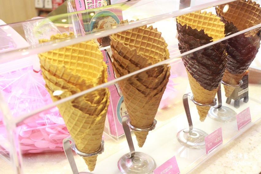 小甜筒免費,照片中的手工脆皮甜筒要加20元,右邊的巧克力脆皮甜筒要加30元,是現場製作的。