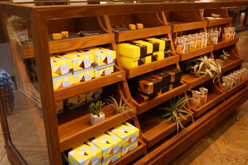 質樸的木櫃加上玻璃門片,陳列出幾何圖形設計出來的包裝盒。