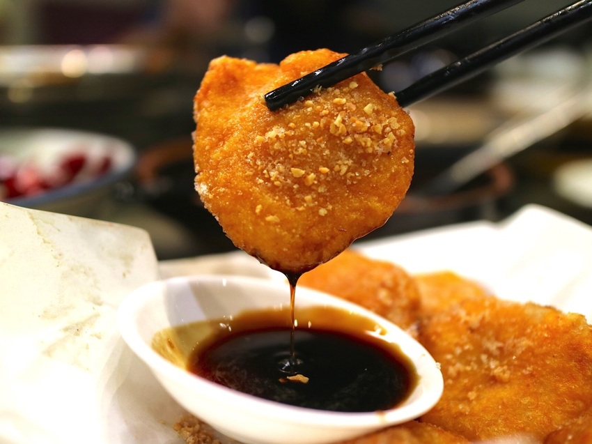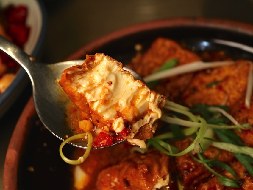 外皮過油微炸,讓嫩豆腐外皮變老,裡面卻還是嫩的!