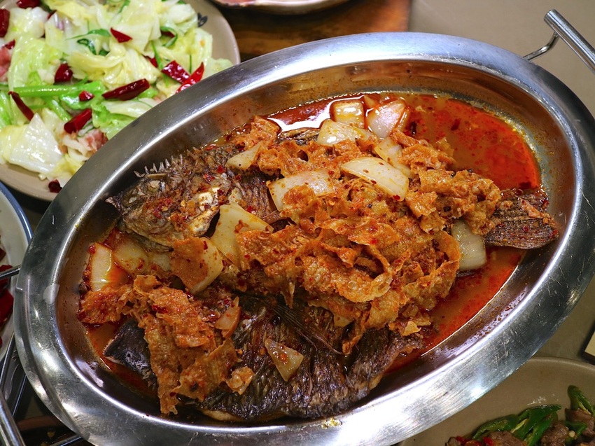 點這道《重慶麻辣烤魚》,還以為會是叢林烤魚之類的料理,送上時發現是道超紅~的鐵板魚料理!