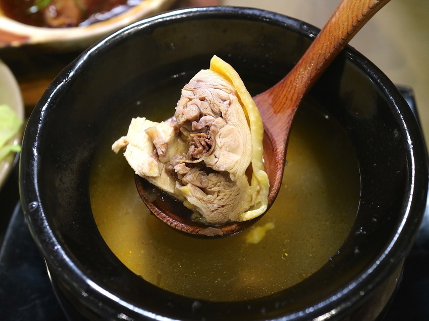 一小盅的鍋湯,裡面有著大塊的土雞腿肉,肉質也是滿嫩的