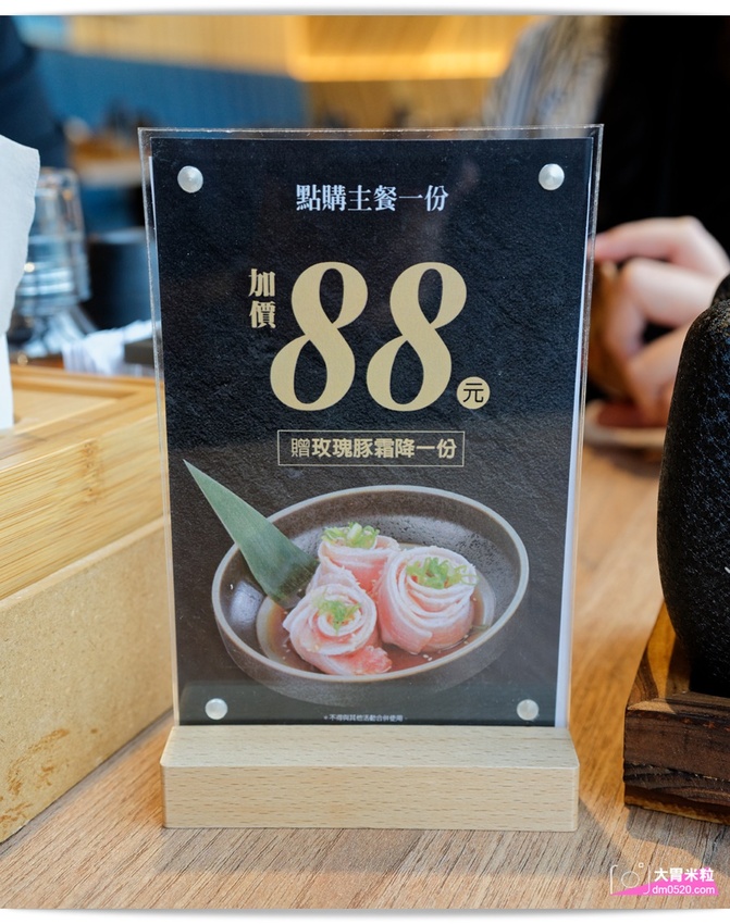 目前優惠活動:點主餐可優惠加購88元(原價168元)享受玫瑰豚霜降豬肉一份