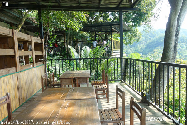 簡單的木造看檯用餐區,戶外區可以欣賞明德水庫的風景,