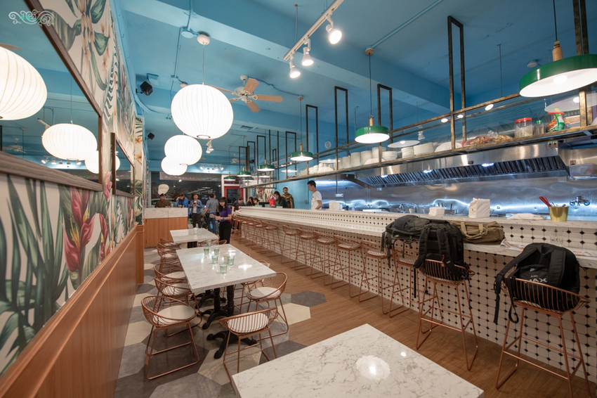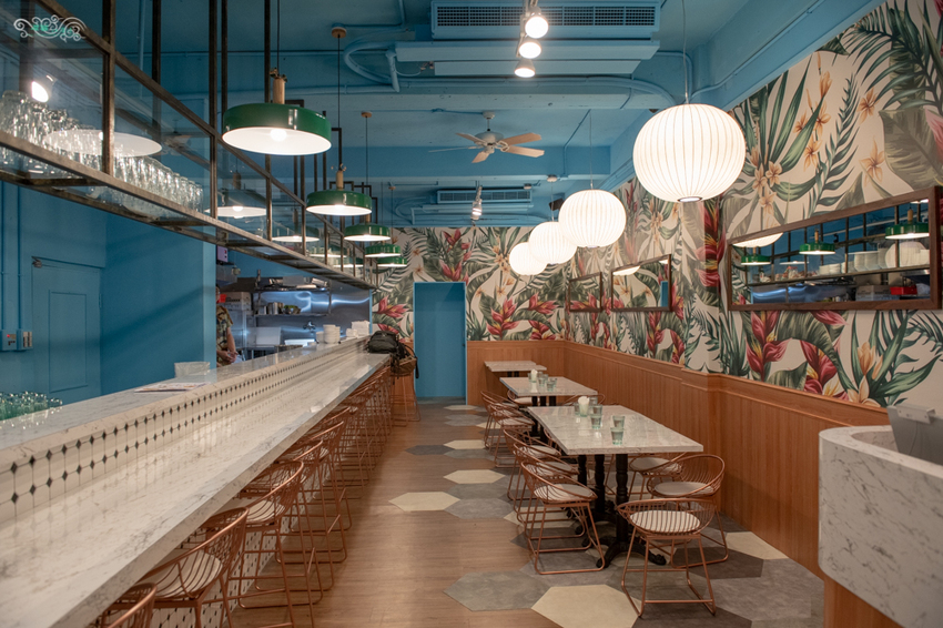 吧台與桌面以有沁涼感受的大理石紋路鋪陳,佐以海洋藍為基調的裝潢,讓人有種夏夜晚風的視覺感受,大面積的南洋熱情印花牆面,營造濃濃的南洋島嶼風情,既亮麗又感覺熱情洋溢。木質地板搭配理性幾何構圖,豐富了空間的層次感。半開放的吧台將廚房區隔開來,卻又同時連接用餐空間,提昇整體環境的寬敞舒適感。