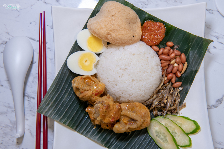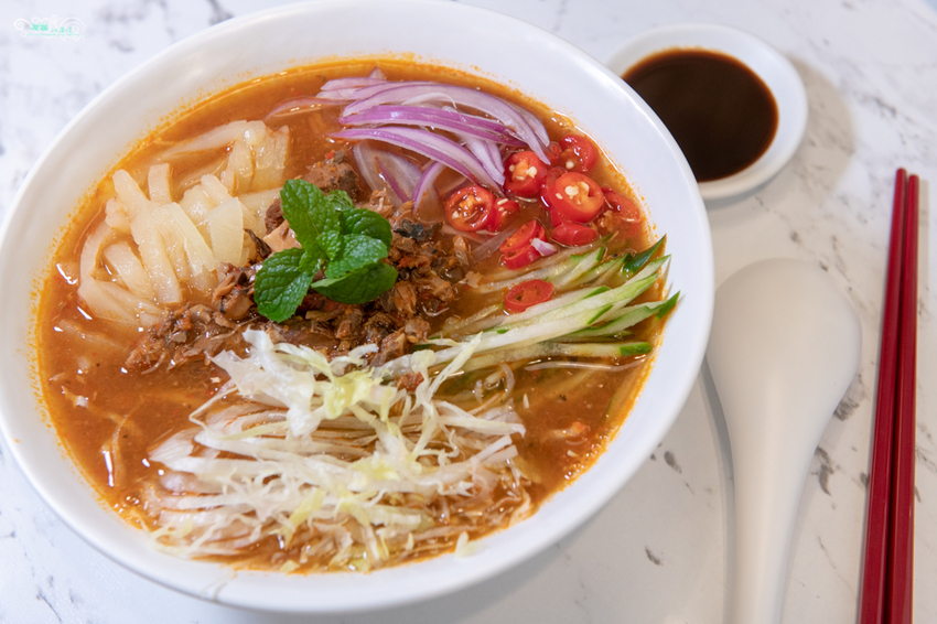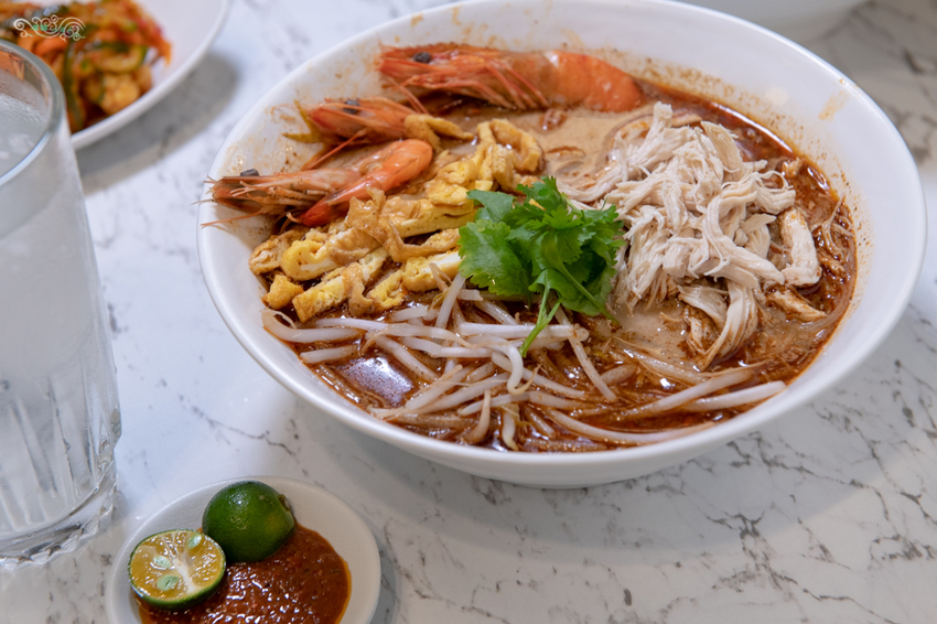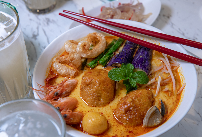 堪稱是星馬料理的代表美食,利用椰漿與多種咖哩香料熬煮的雞高湯,香濃滑順,整碗配料非常豐富,有長豆、茄子、炸豬皮、蝦子、蛤蜊、魚蛋跟油豆泡,再放入豆芽、香菜和青蔥, 所有配料幾乎都吸滿湯汁的精華,一口配料一口黃麵,在嘴裡綻放極盡奢華的滋味。如果把配料沾著三八醬一起吃,極致美味讓人不禁豎起拇指讚嘆,然後一口接一口。
