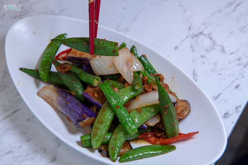 利用三八醬去炒四種當季食蔬-長豆、茄子、秋葵跟甜豆。吃完之後,不得不讚美一下三八醬,生鮮蔬菜的清甜被濃濃的三八醬微微托起,辛香料讓人很難忘記他是一道南洋美味。