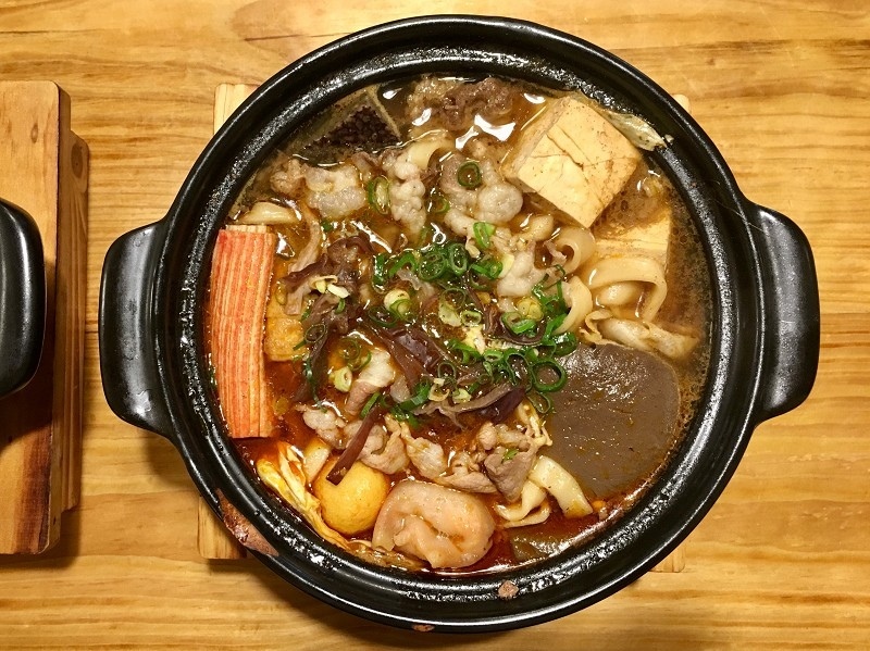 鍋物的料有豆腐、鴨血、木耳、高麗菜、金針菇