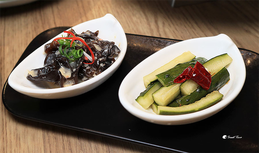 涼菜二拼 - 選擇的是椒麻川味黃瓜及腐乳雲耳,黃瓜帶點些微的辣相當清爽,而雲耳搭配上腐乳口感突出又美味,個人還滿喜歡的喔。