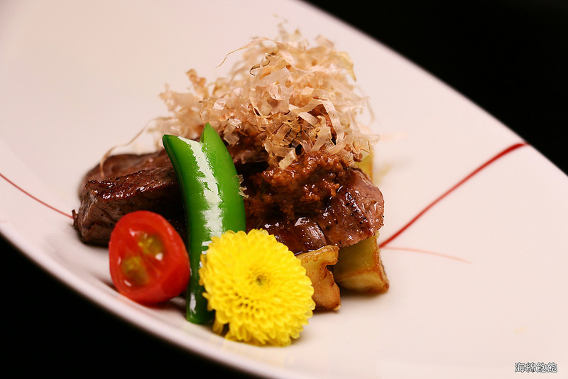沙朗牛肉煎至5~7分熟,灑上跳動的柴魚片