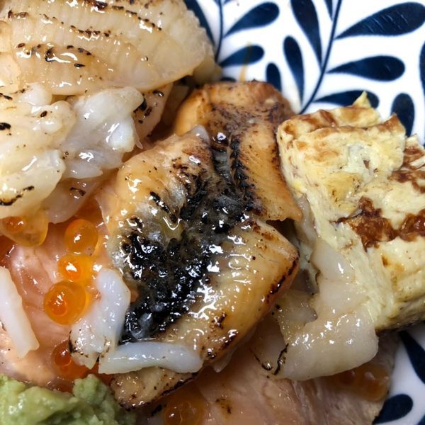 裡面有干貝、鮭魚、鰻魚、花枝。比目魚、鮭魚卵、玉子燒