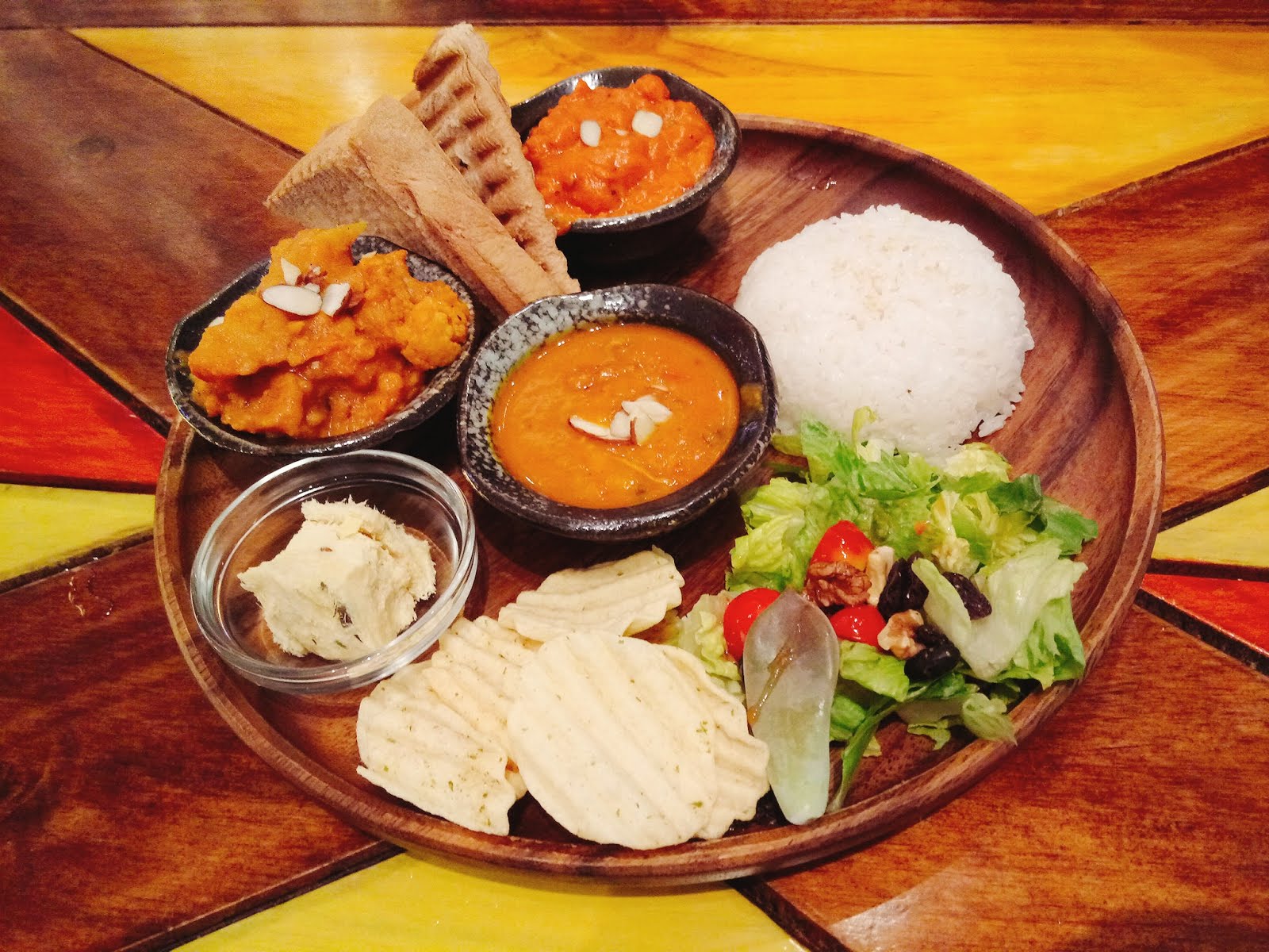 印度塔麗 (三種咖哩),附沙拉/全麥麵包/酸黃瓜/薯片/香料飯。