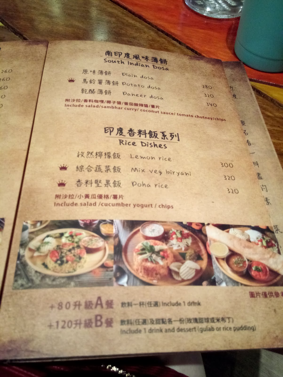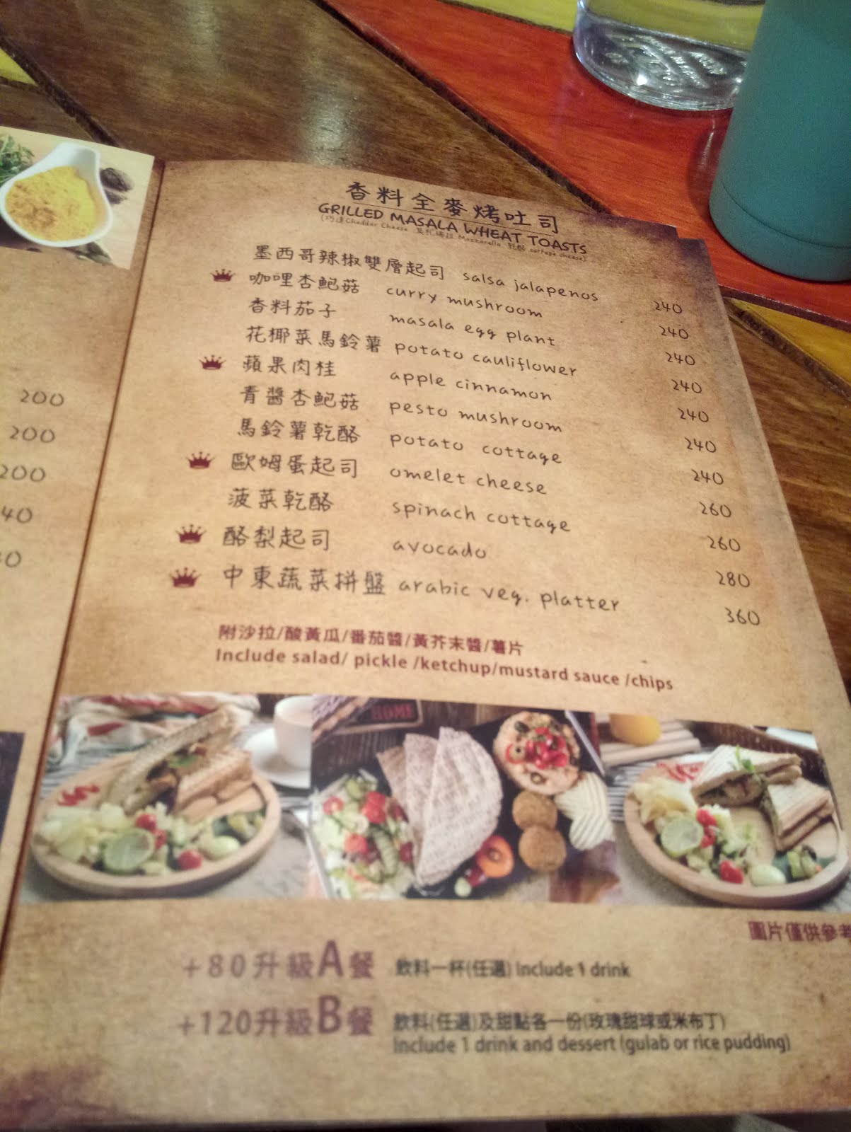整體來說有點失望除了CP值不高,還有那個像薑的香料衝擊我的味覺,或許是沒吃過正宗的印度料理無法比較,但以個人口味而言真的不太愛,不過咖哩杏鮑菇全麥烤吐司大推。雖然是不合我胃,但不會難吃,偶而吃一下平常少吃的異國料理,也是別有一翻風味。
