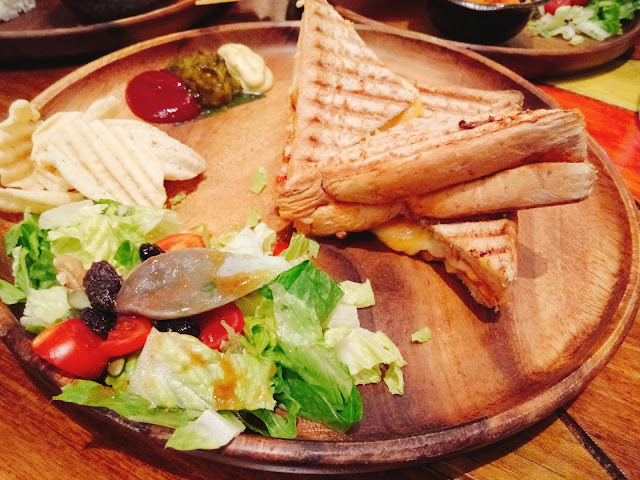 咖哩杏鮑菇全麥烤吐司,附沙拉/酸黃瓜/番茄醬/黃芥末醬/薯片。