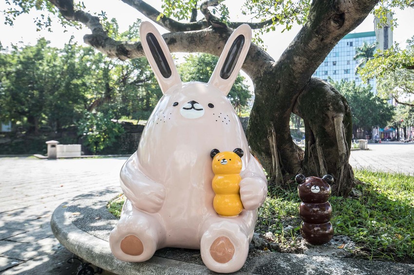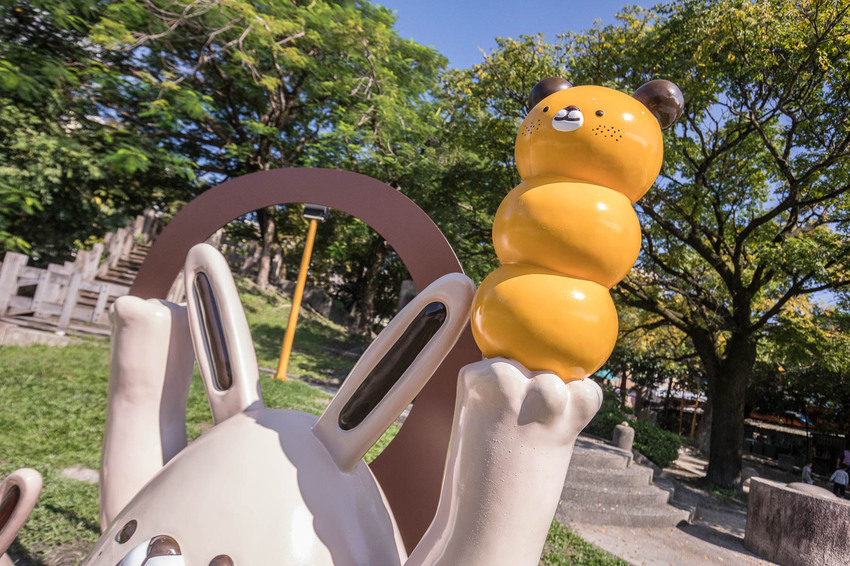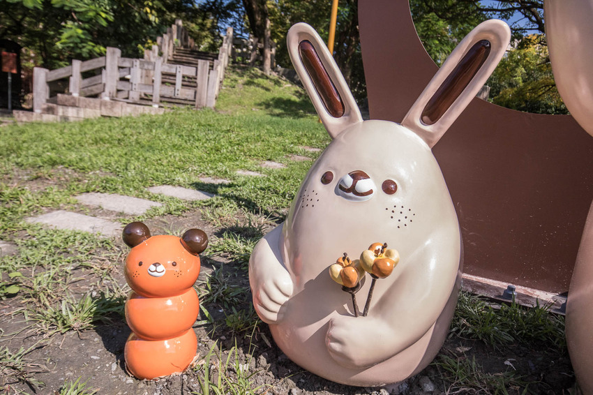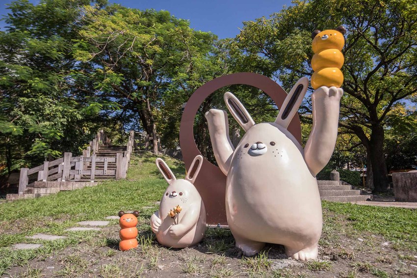 嗨嗨嗨!我們在這邊!奶油兔舉著麵包君似乎是在招喚著大家一起來中山公園裡野餐呢!