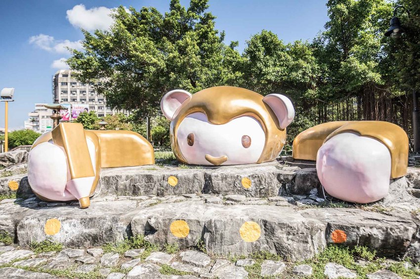 從面對中山公園正前方往左走,在花圃我們發現了第一個裝置藝術:希望的小金人