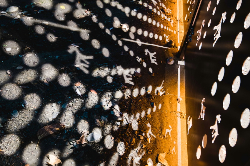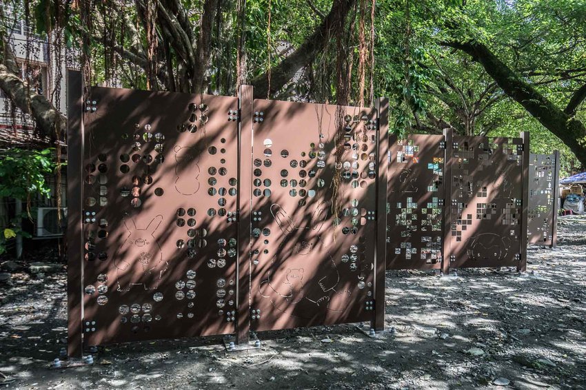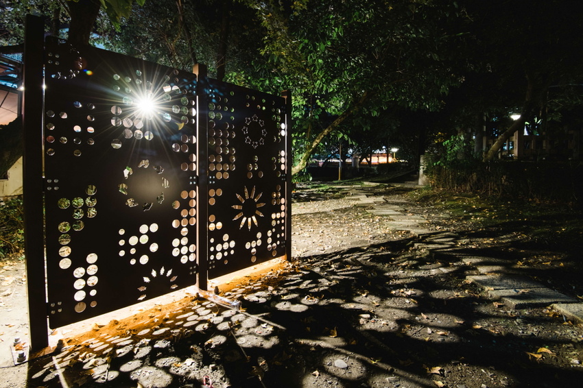 在中山公園的周邊可以看到許多像這樣的簍空格柵,因為周邊是羅東夜市,所以像是冷氣的室外機或是水管都會外露,實在很影響觀瞻,所以改造團隊特別設計了這樣的格柵,不僅擋住了礙眼的景觀,到了晚上還在背面打上燈,讓公園變得明亮起來,且藉由上面的光雕,將圖案印照在地面上,形成一幅超特別的光雕藝術呢