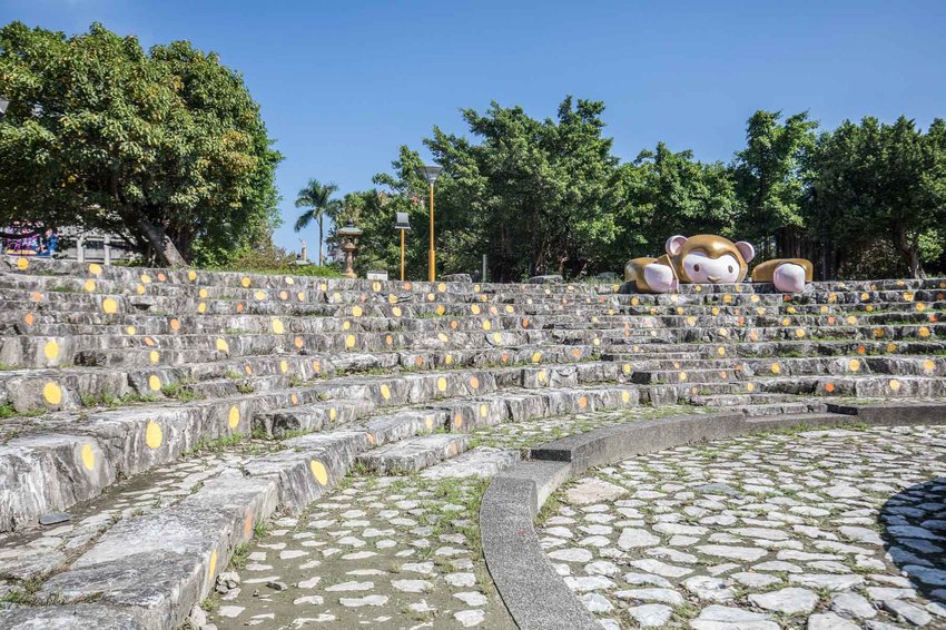 中山公園內的戶外展演舞台,馬賽Kyo所創作的愛畫畫的東東就在這裡,東東總是安安靜靜的待在觀眾席看著不同的表演,當人群散去,東東便拿起畫筆,在階梯上咨意塗鴉,為灰暗的階梯繪上亮麗耀眼的色彩