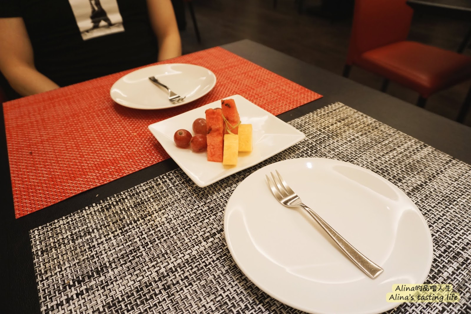 在樸素的桌上放了這餐桌墊,紅色和黑白色的對比搭得很剛好,菜單沒有多一層裝套的份量感,不過這種簡單的配置感覺也不錯!