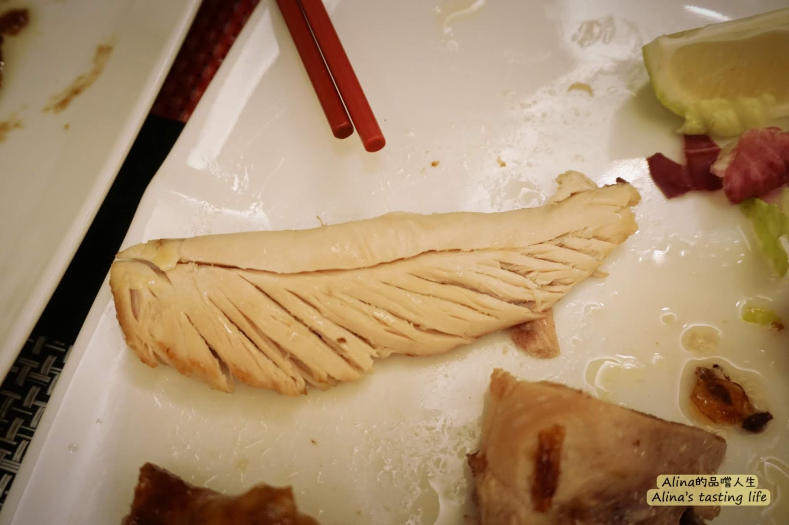 除了帶皮的雞肉外,裡面有片雞胸肉,有用刀劃過的條線,不過當我們吃到時肉已經有點冷掉了,不是熱呼呼的狀態就沒有那麼讚啦~