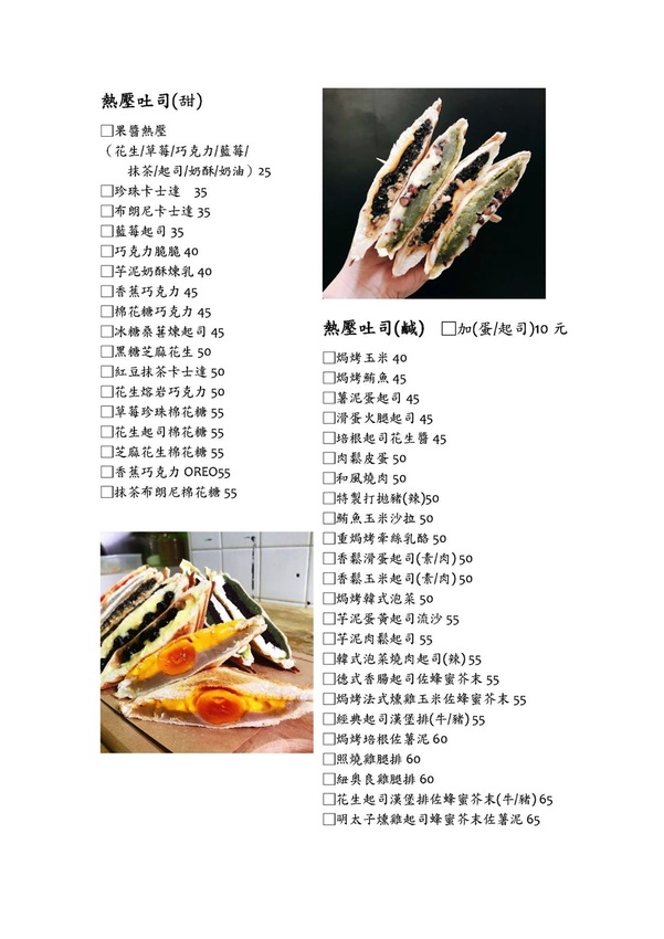 他們家主打熱壓吐司,甜口味+鹹口味+季節限定的創意口味,將近百種的熱壓吐司