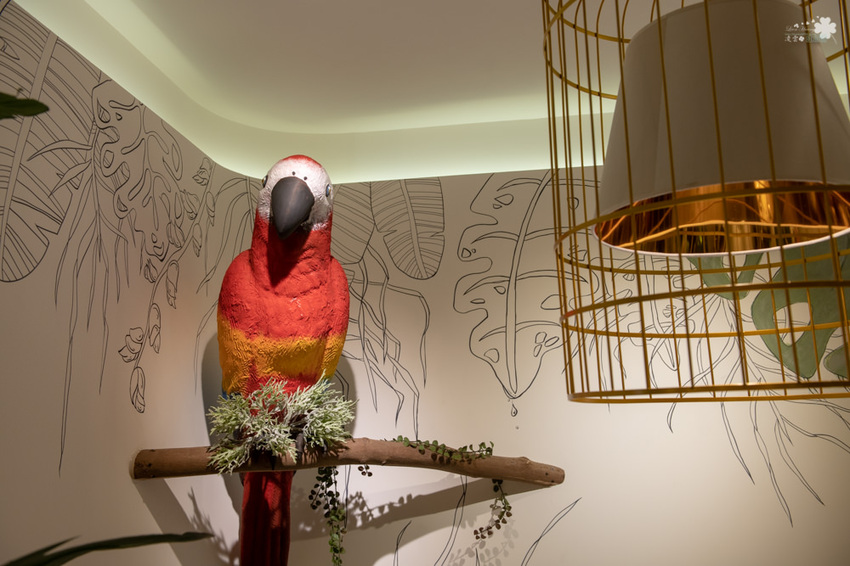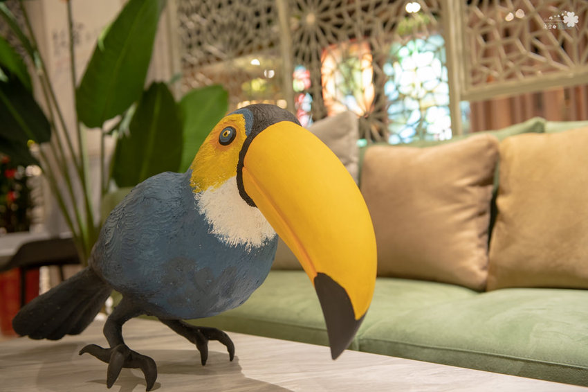 座位區四周有幾種大型的鳥兒立體裝置藝術,為時尚南洋風格的室內裝潢,更添幾許生動的活力,與這些鳥兒合影,增添打卡樂趣與話題性。
