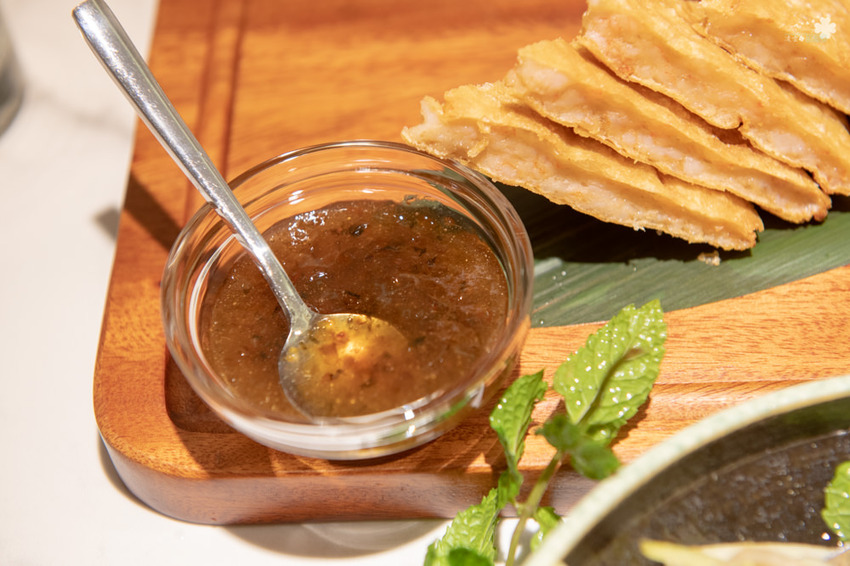 這道已是標準的泰式代表性料理,幾乎是每訪必點的菜色,薄脆外皮包著新鮮的蝦漿,搭配紫蘇梅醬帶來味道的組織變化,道地的泰式美味。